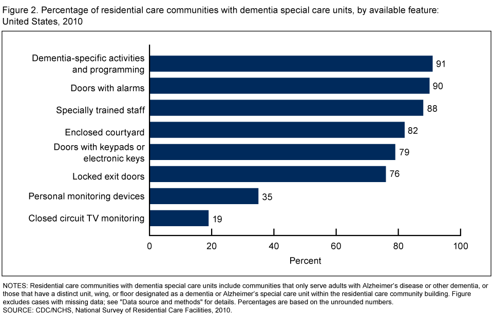 • At least 7 out of 10 residential care communities with dementia special care units had features such as specially trained staff (88%), an enclosed courtyard (82%), doors with keypads or electronic keys (79%), and locked exit doors (76%).