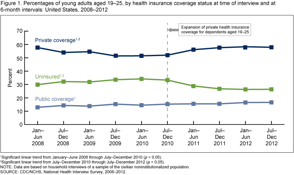 Kirzinger WK, Cohen RA, Gindi RM. Trends in insurance coverage and source of private coverage among young adults aged 19–25: United States, 2008–2012. NCHS data brief, no 137. Hyattsville, MD: National Center for Health Statistics. 2013.