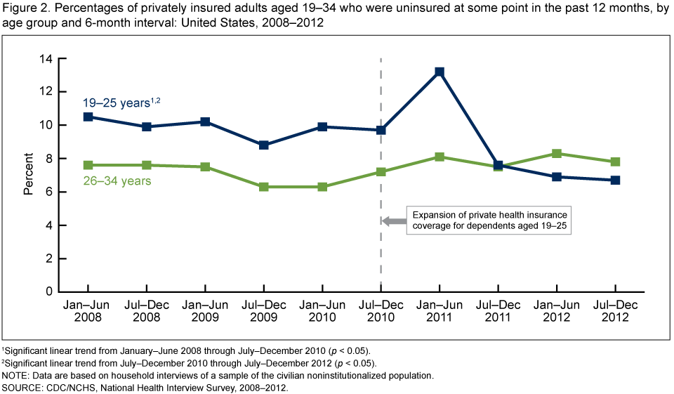 • For each 6-month interval from January–June 2008 through January–June 2011, the percentage of adults who had been uninsured at some time in the past 12 months was significantly higher among those aged 19–25 compared with those aged 26–34. From July–December 2011 to July–December 2012, the two age groups did not differ significantly.