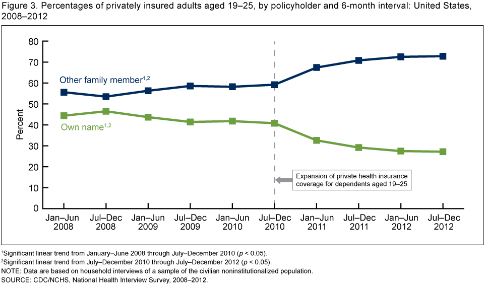 Figure 3. Percentages of privately insured adults aged 19–25, by policyholder and 6-month interval: United States, 2008–2012