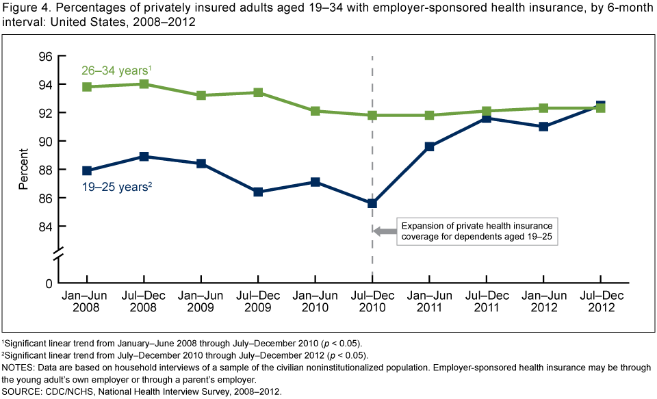 • By comparison, a decreasing trend was apparent in the percentage of adults aged 26–34 with employer-sponsored health insurance from the first 6 months of 2008 through the last 6 months of 2010 (93.8% to 91.8%), but the percentages remained stable from the last 6 months of 2010 through the last 6 months of 2012.