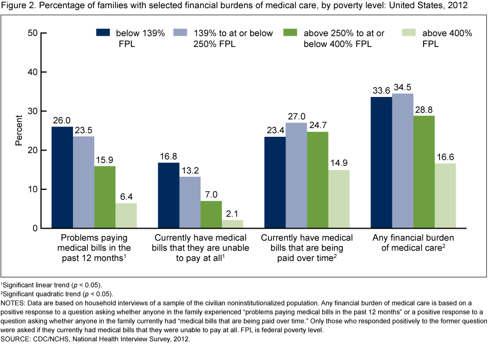 Figure 2. Percentage of families with selected financial burdens of medical care, by poverty level: United States, 2012