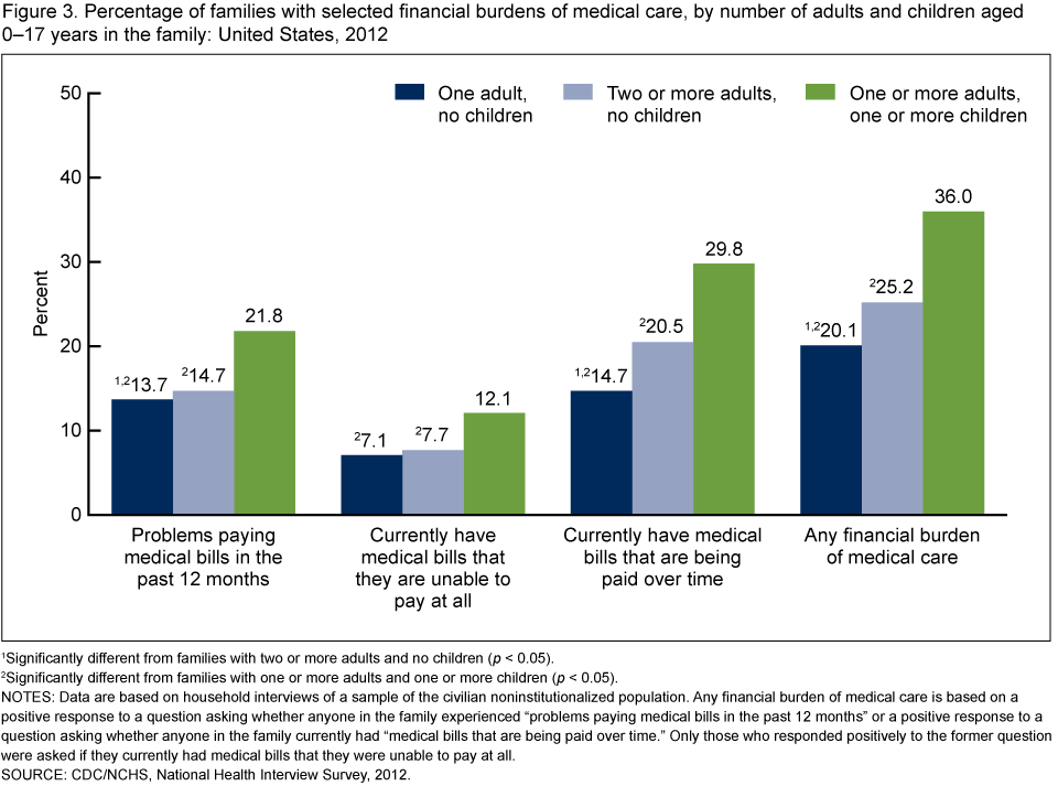 Figure 3. Percentage of families with selected financial burdens of medical care, by number of adults and children aged 0–17 years in the family: United States, 2012