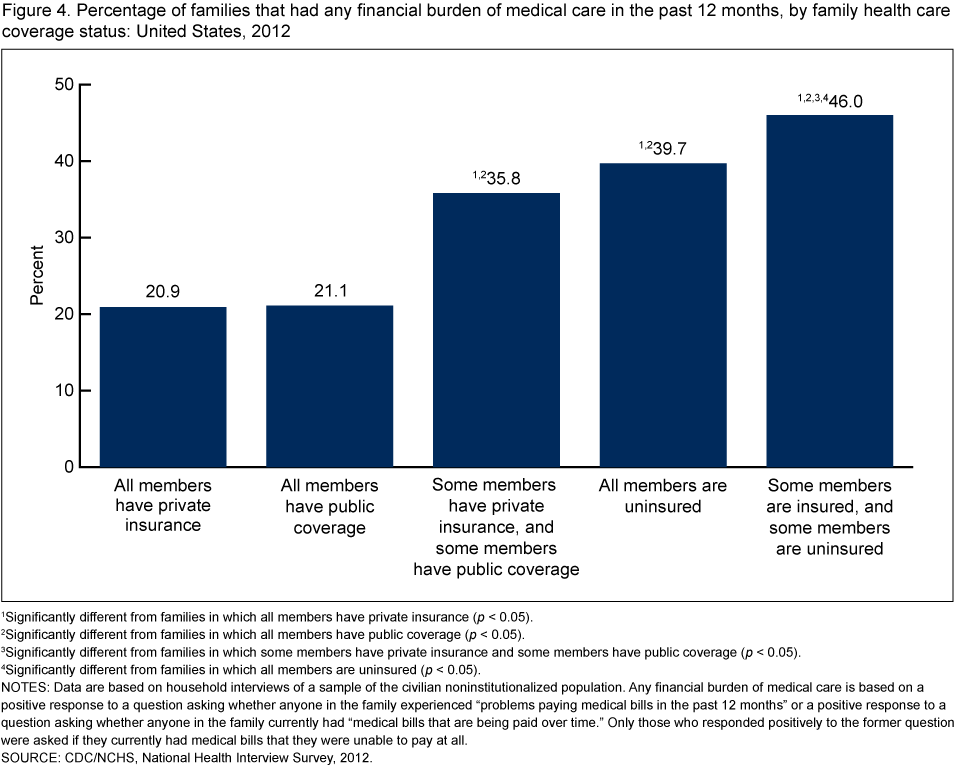 Figure 4. Percentage of families that had any financial burden of medical care in the past 12 months, by family health care coverage status: United States, 2012