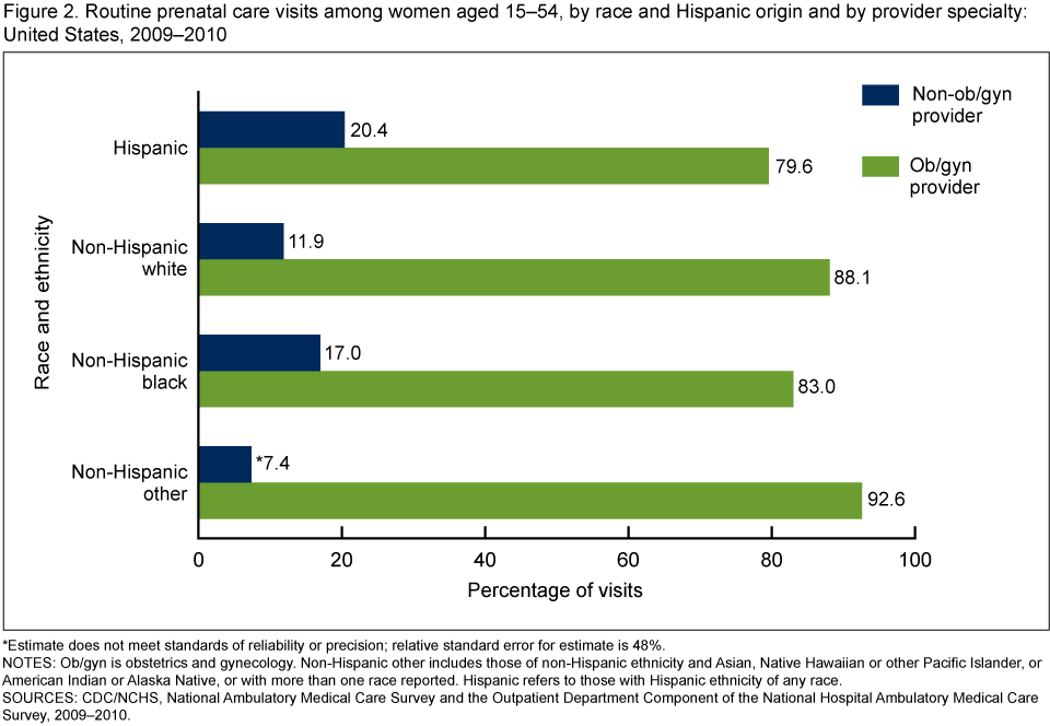 - The percentage of prenatal visits to non-ob/gyn providers did not differ by race and ethnicity group in 2009–2010.