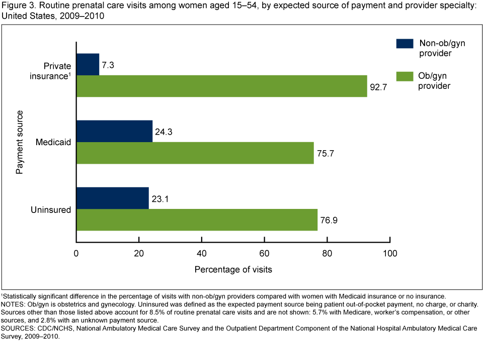 - Visits to non-ob/gyn providers accounted for a higher percentage of routine prenatal care visits among women with Medicaid (24.3%) and women with no insurance (23.1%) compared with women with private insurance (7.3%).