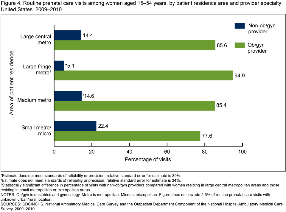 - The percentage of routine prenatal care visits at which women saw non-ob/gyn providers varied by the geographic location of patients’ residence in 2009–2010.