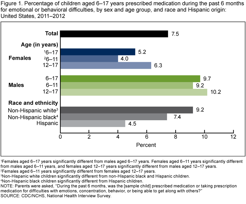Howie LD, Pastor PN, Lukacs SL. Use of medication prescribed for emotional or behavioral difficulties among children aged 6–17 years in the United States, 2011–2012. NCHS data brief, no 148. Hyattsville, MD: National Center for Health Statistics. 2014.