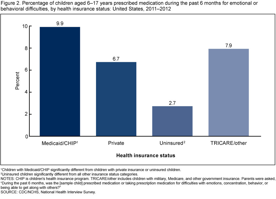 Figure 2. Percentage of children aged 6–17 years prescribed medication during the past 6 months for emotional or behavioral difficulties, by health insurance status: United States, 2011–2012