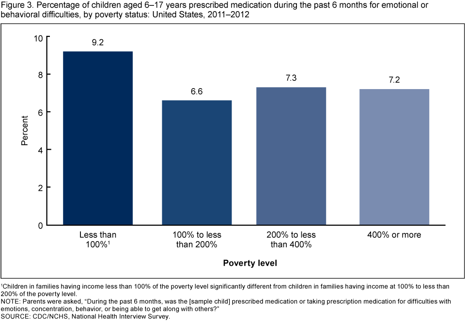 • A higher percentage of children in families having income below 100% of the poverty level used prescribed medication for emotional or behavioral difficulties than children in families at 100% to less than 200% of the poverty level.