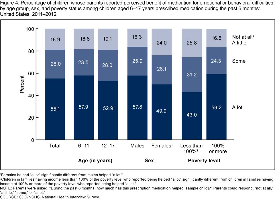Among children aged 6–17 years who used medication prescribed for emotional or behavioral difficulties, more than one-half (55.1%) had a parent report that the medication helped the child "a lot," 26.0% were helped "some," and 18.9% were not helped ("not at all" or helped "a little"). The percentage of children who were helped "a lot" by the medication did not vary between older and younger children, but it was lower for females (49.9%) compared with males (57.8%) and lower for children in families having income below 100% of the poverty level (43.0%) compared with children in families having income at 100% or more of the poverty level (59.2%) (Figure 4).