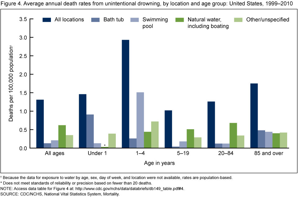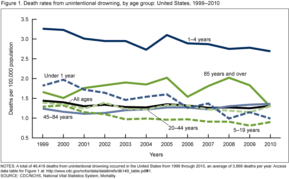 Xu JQ. Unintentional drowning deaths in the United States, 1999–2010. NCHS data brief, no 149. Hyattsville, MD: National Center for Health Statistics. 2014.