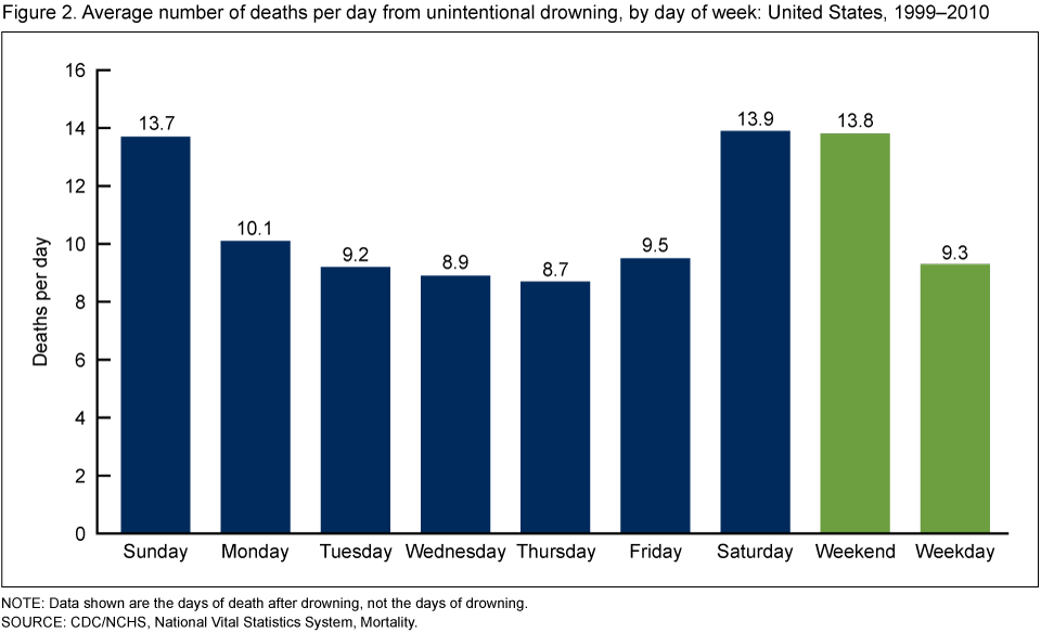 - The average daily number of deaths from unintentional drowning on a weekend day was 48% higher than that on a weekday (13.8 versus 9.3 deaths).