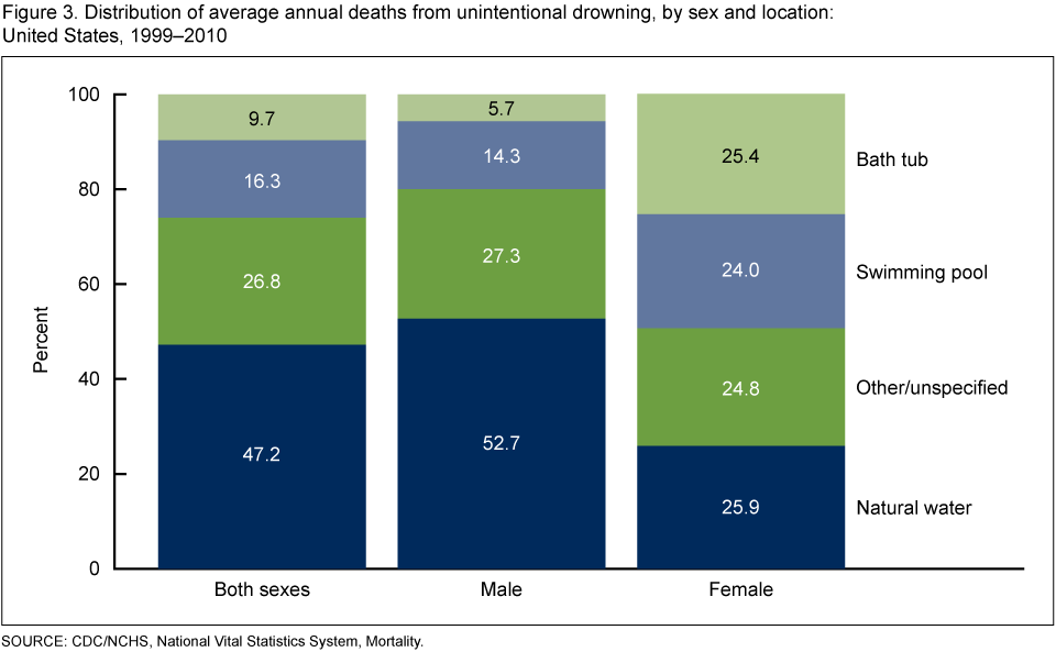 For males, drowning was most likely to occur in natural water; this location accounted for more than 52.7% of all unintentional drowning. For females, however, drowning occurred with approximately equal likelihood in natural water, bath tubs, and swimming pools.