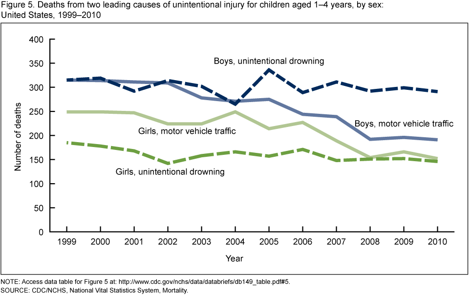 Figure 5. Deaths from two leading causes of unintentional injury for children aged 1–4 years, by sex: United States, 1999–2010