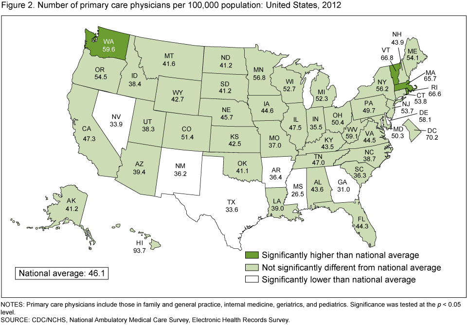 Figure 2. Number of primary care physicians per 100,000 population: United States, 2012