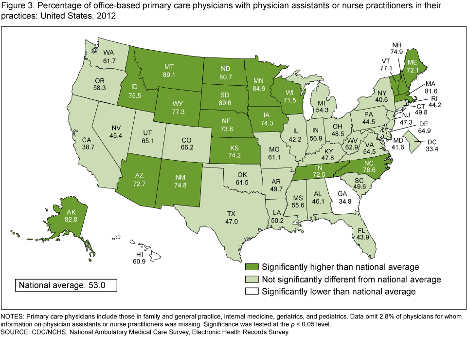 Physician assistants and nurse practitioners provide a substantial amount of primary care (2,3). A previous study found twice as many nurse practitioners (18.9%) as physician assistants (10.3%) among primary care providers (5). In 2012, 53% of primary care physicians had physician assistant or nurse practitioners in their practices. States varied in the availability of physician assistants and nurse practitioners in physician offices. The percentage of physicians with physician assistants or nurse practitioners in their practices exceeded the national average in 19 states (Alaska, Arizona, Idaho, Iowa, Kansas, Maine, Massachusetts, Minnesota, Montana, Nebraska, New Hampshire, New Mexico, North Carolina, North Dakota, South Dakota, Tennessee, Vermont, Wisconsin, and Wyoming) and was lower than the national average in Georgia.