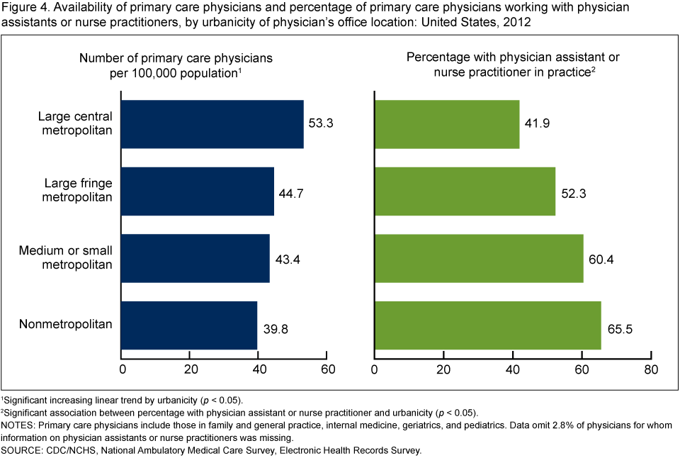 Figure 4. Availability of primary care physicians and percentage of primary care physicians working with physician assistants or nurse practitioners, by urbanicity of physician's office location: United States, 2012