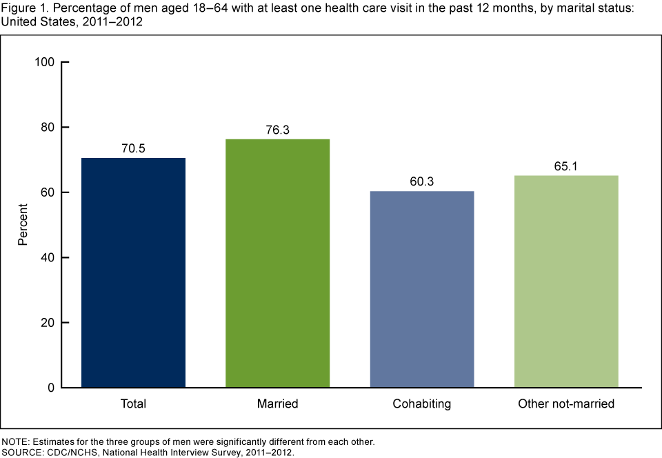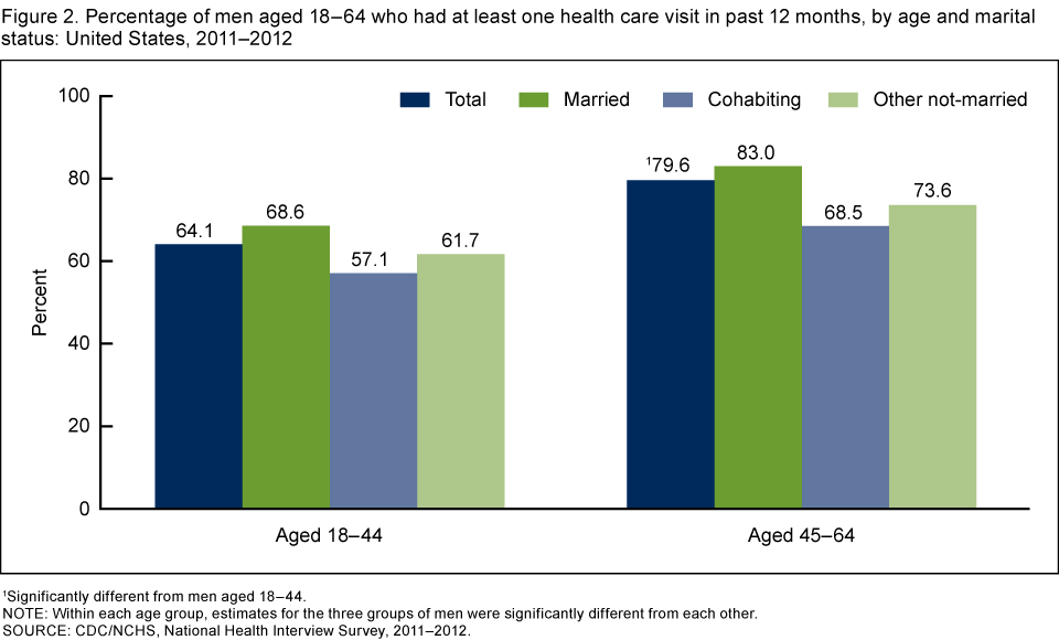 - Among men aged 18–64, those who were married were more likely than cohabiting men and other not-married men to have had a health care visit in the past 12 months.