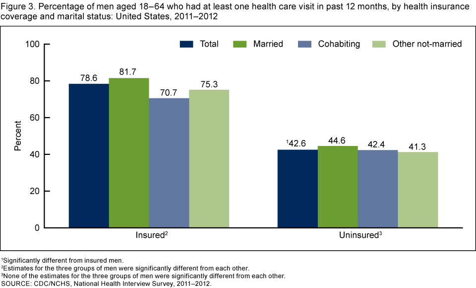 - Married men were more likely than cohabiting men and other not-married men to have had a health care visit in the past 12 months only if they were insured.