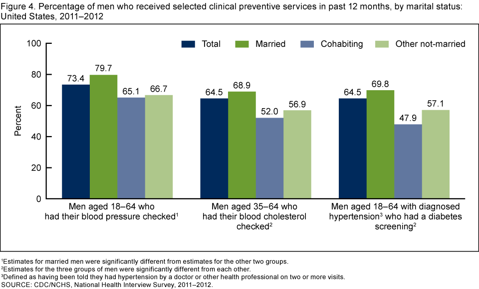 - Among those for whom blood pressure, cholesterol, and diabetes screenings are recommended by the U.S. Preventive Services Task Force, married men were more likely than cohabiting men to have received these clinical preventive services in the past 12 months.