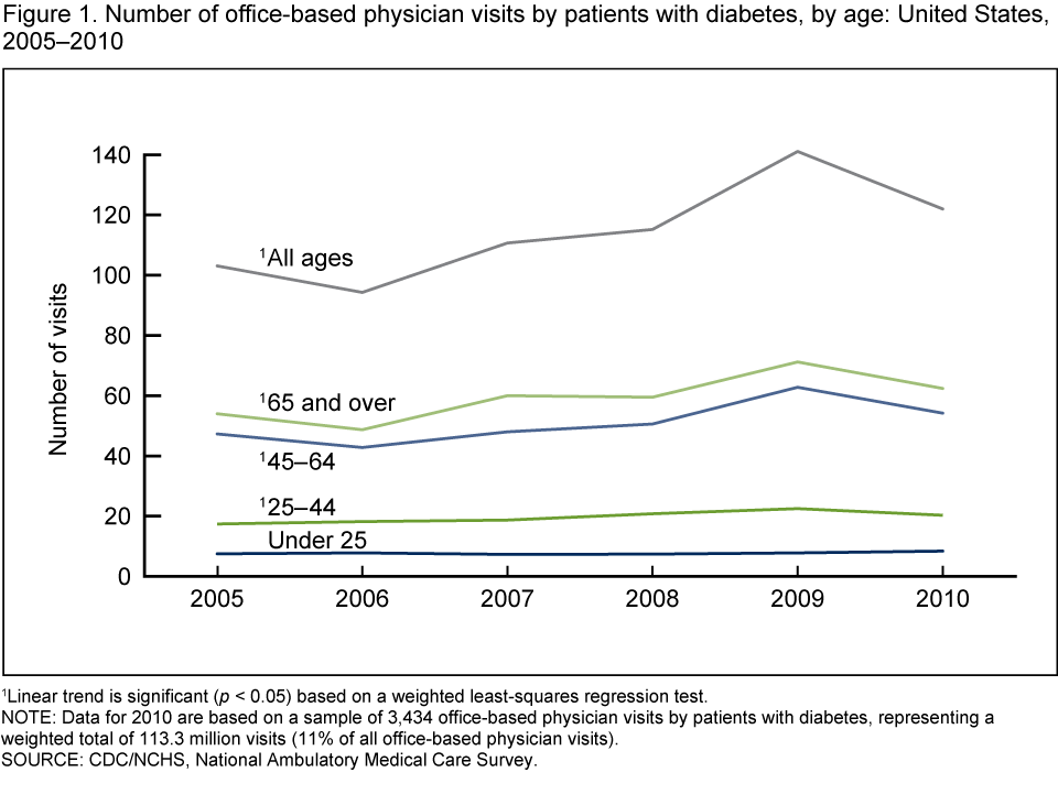 - Overall office-based physician visits by patients with diabetes increased 20% from 94.4 million in 2005 to 113.3 million in 2010 (Figure 1).