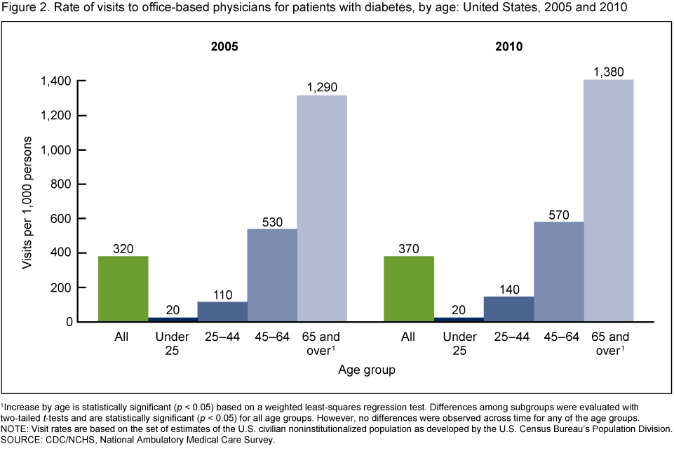 - The rate of physician office visits by patients with diabetes was not statistically different from 2005 to 2010 for all age groups (Figure 2).