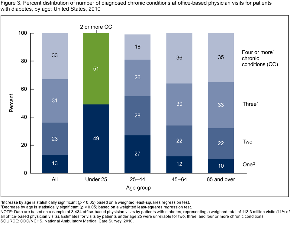 - Diabetes was the only chronic condition for 49% of the visits made by patients under age 25, but the only chronic condition for 10% of the visits made by patients aged 65 and over.