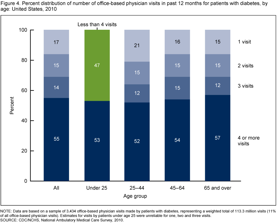 - Regardless of age, more than one-half of the visits by patients with diabetes (55%) were by those who made an office visit to the sampled doctor four or more times in the past 12 months.