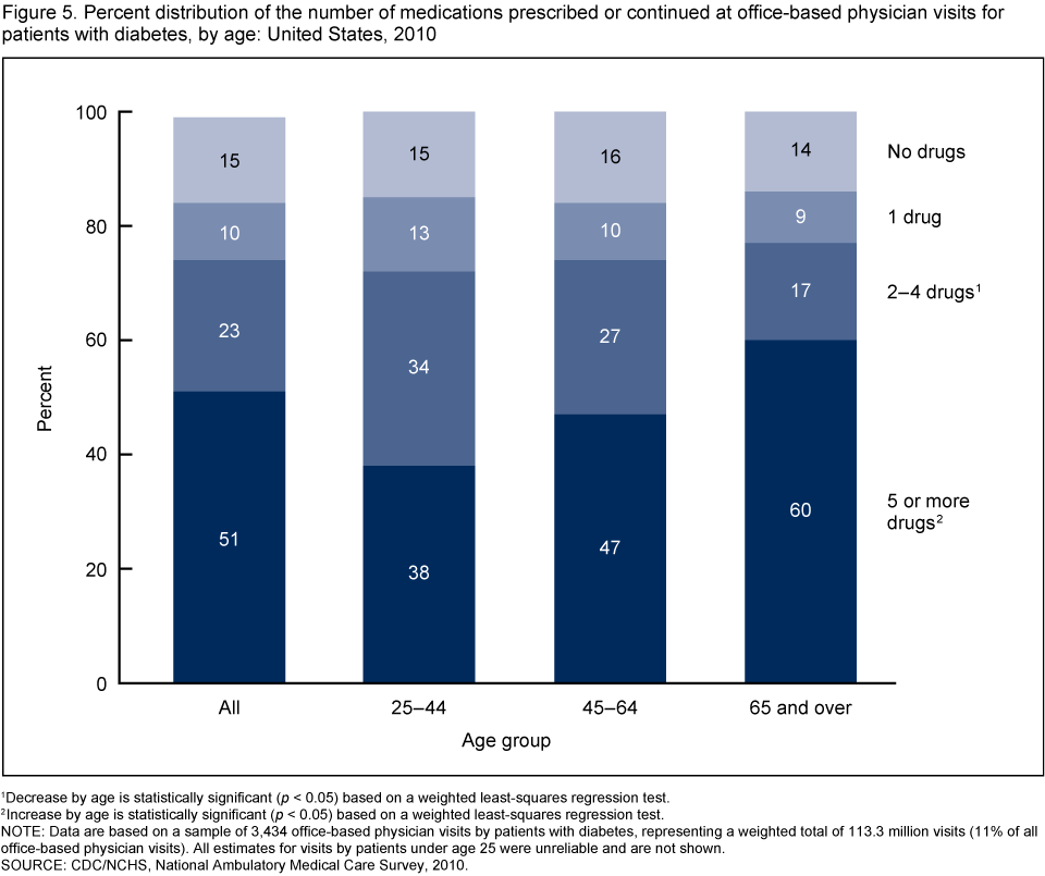 - Five or more drugs were prescribed or continued at 38% of the visits by patients with diabetes aged 25–44, and at 60% of the visits by those aged 65 and over.