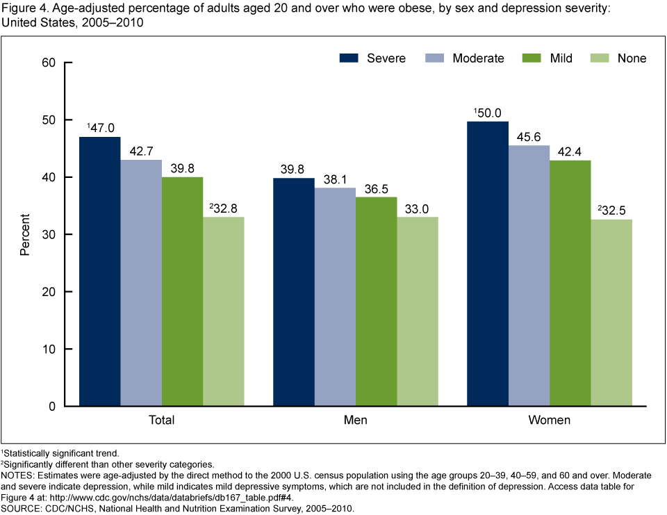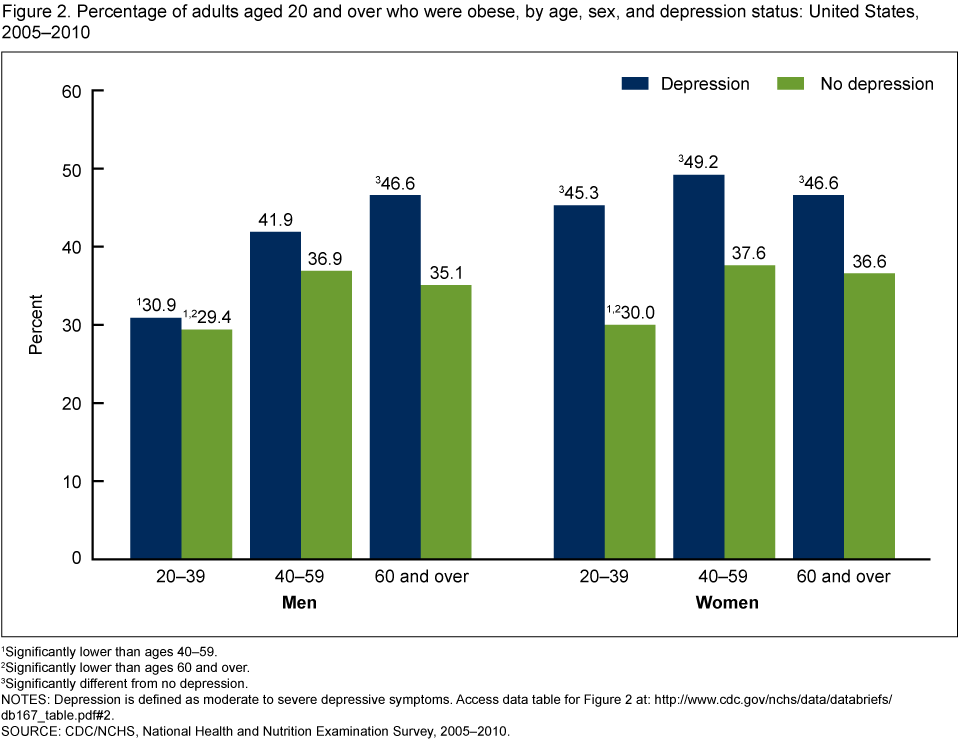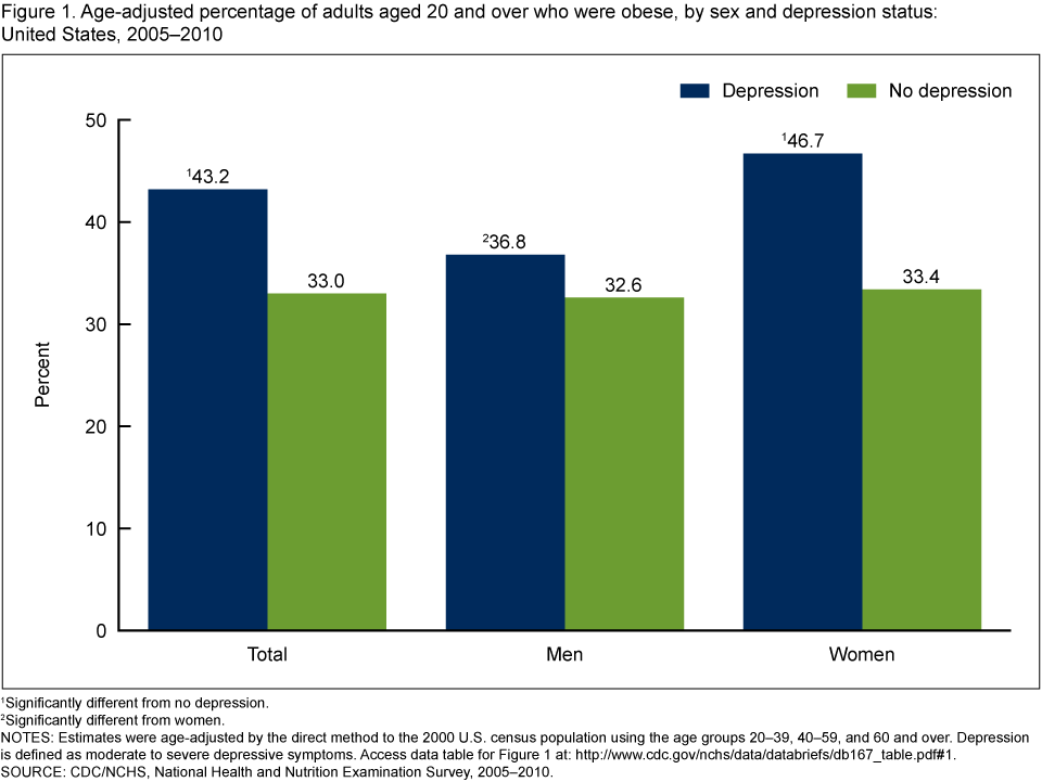 Pratt LA, Brody DJ. Depression and obesity in the U.S. adult household population, 2005–2010. NCHS data brief, no 167. Hyattsville, MD: National Center for Health Statistics. 2014.