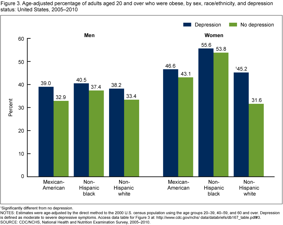 - Forty-five percent of non-Hispanic white women with depression were obese, while 32% of non-Hispanic white women who did not have depression were obese (Figure 3).
