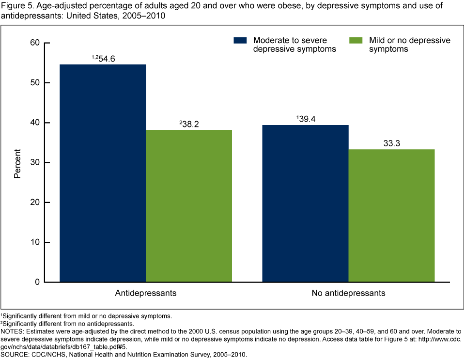 - Among adults who took antidepressant medication, of those with moderate or severe depressive symptoms, 55% were obese while 38% with mild or no depressive symptoms were obese (Figure 5).