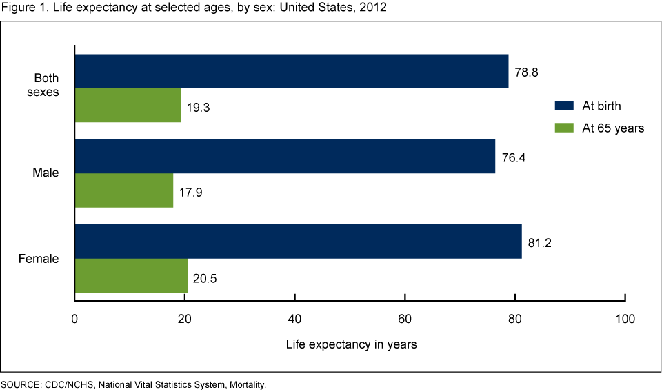Life expectancy at birth represents the average number of years that a group of infants would live if the group was to experience throughout life the age-specific death rates present in the year of birth. U.S. life expectancy at birth for the total population was 78.8 years in 2012—an increase of 0.1 year from 78.7 years in 2011 (Figure 1). In 2012, life expectancy was 81.2 years for females and 76.4 for males. Life expectancy for females was consistently higher than that for males. In 2012, the difference in life expectancy between females and males was 4.8 years, the same as in 2011.