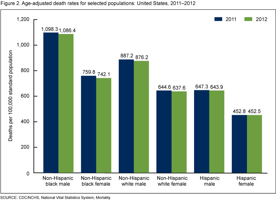 The age-adjusted death rate for the total non-Hispanic population declined 1.2% from 759.2 per 100,000 population in 2011 to 749.8 in 2012. From 2011 to 2012, age-adjusted death rates in the United States significantly decreased for both males and females among non-Hispanic white and non-Hispanic black populations. The rate decreased 1.2% for non-Hispanic white males, and 1.1% for non-Hispanic white females and for non-Hispanic black males (Figure 2). The largest decrease (2.3%) in mortality from 2011 to 2012 was among non-Hispanic black females. Age-adjusted death rates for Hispanic males and Hispanic females did not change significantly.