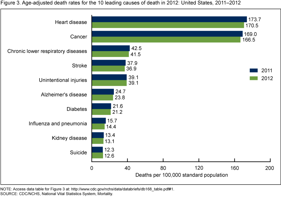 From 2011 to 2012, age-adjusted death rates declined significantly for 8 of 10 leading causes of death. The rate decreased 1.8% for heart disease, 1.5% for cancer, 2.4% for chronic lower respiratory diseases, 2.6% for stroke, 3.6% for Alzheimer's disease, 1.9% for diabetes, 8.3% for influenza and pneumonia, and 2.2% for kidney disease. The rate for suicide increased 2.4%. The rate for unintentional injuries remained the same.