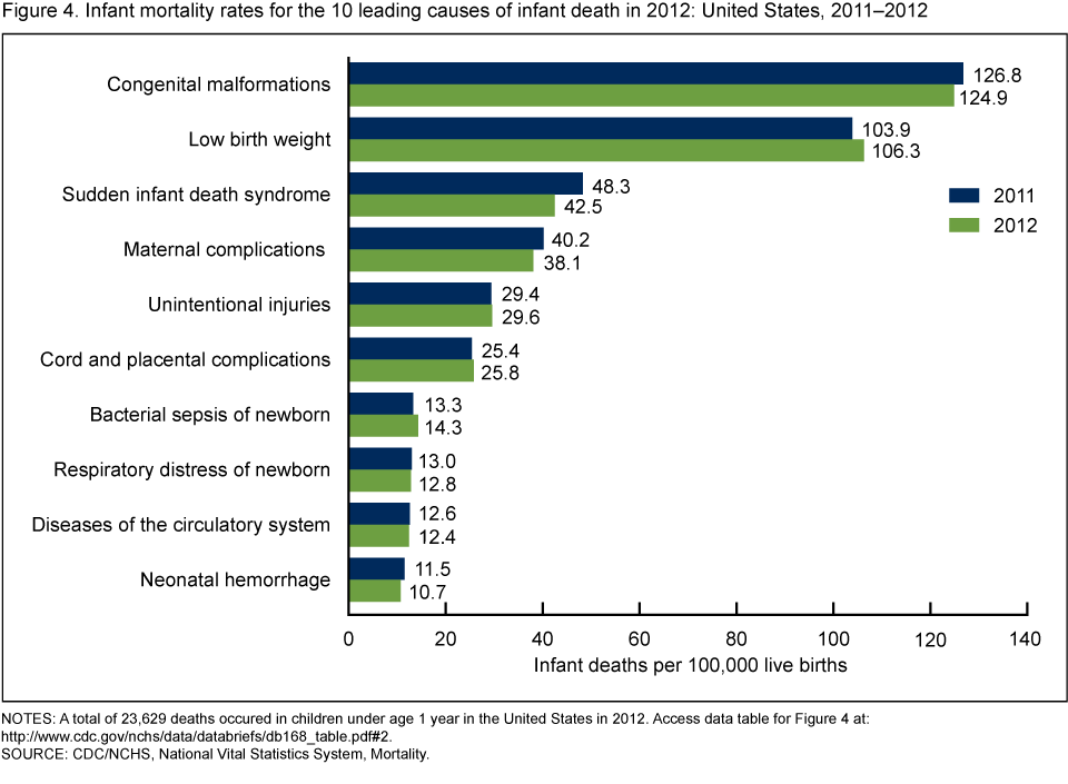 The 10 leading causes of infant death in 2012 accounted for 69.8% of all infant deaths in the United States. The leading causes remained the same as in 2011. The IMR for Sudden infant death syndrome (SIDS) decreased 12.0% from 48.3 infant deaths per 100,000 live births in 2011 to 42.5 in 2012 (Figure 4). Mortality rates for the remaining leading causes of infant death did not change significantly.