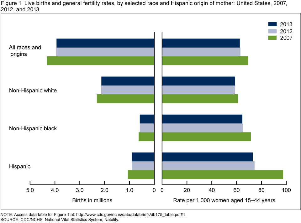 - General fertility rates were down 1% for non-Hispanic black and 2% for Hispanic women from 2012 to 2013, but rose slightly (less than 1%) for non-Hispanic white women. GFRs declined for all race and Hispanic origin groups from 2007 through 2013.