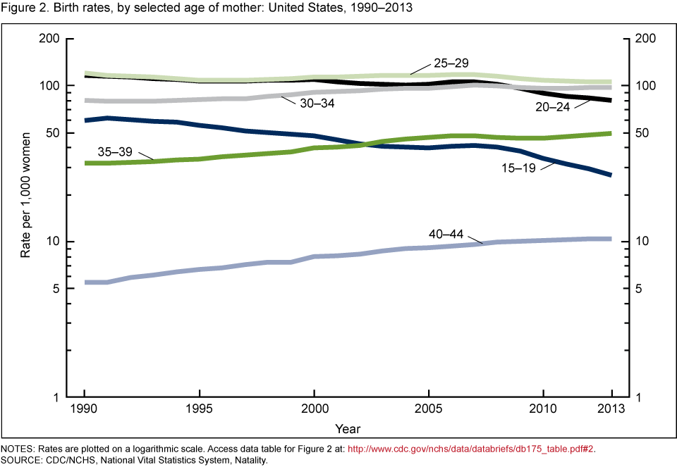 Figure 2. Birth rates, by selected age of mother: United States, 1990–2013