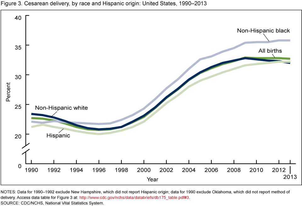 Figure 3. Cesarean delivery, by race and Hispanic origin: United States, 1990–2013