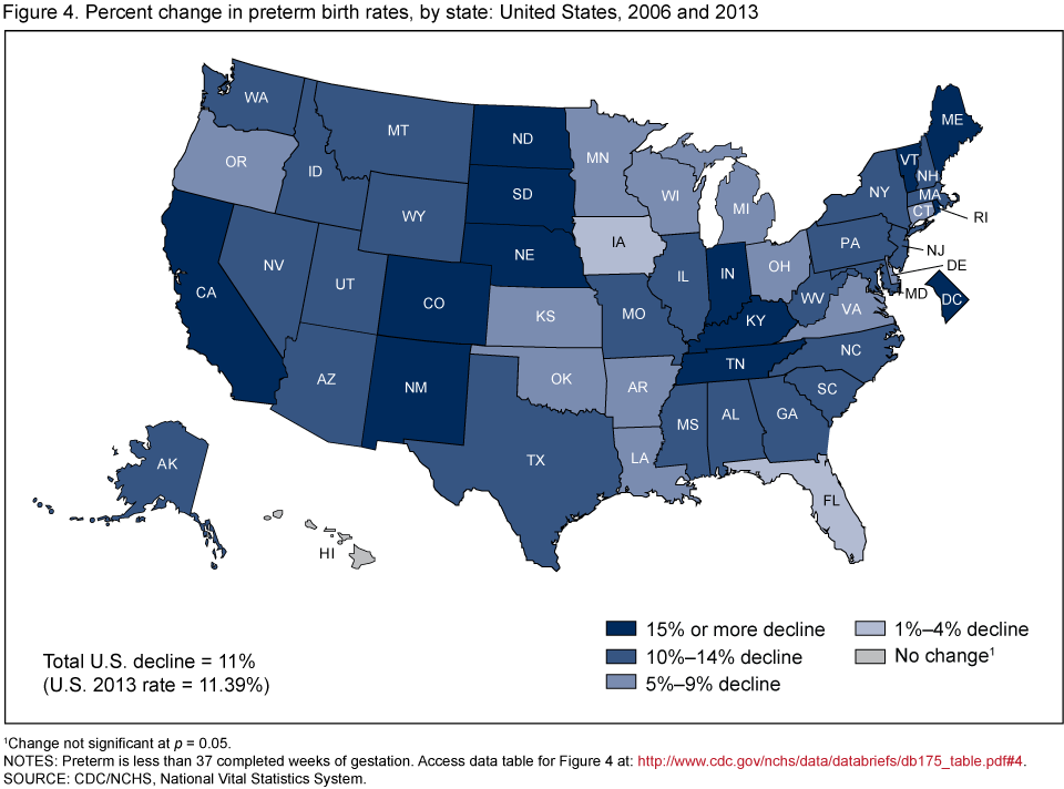 - Reductions in preterm birth rates were reported across the United States during 2006–2013 (Figure 4). Rates declined in 49 states and the District of Columbia; the change for Hawaii was not statistically significant.