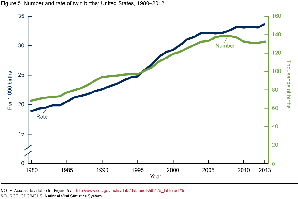 Figure 5. Number and rate of twin births: United States, 1980–2013