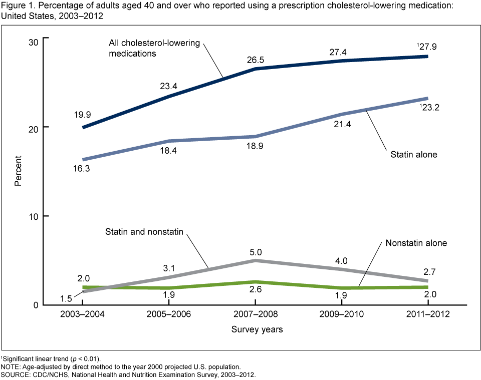 - During 2003–2012, the percentage of adults aged 40 and over using a cholesterol-lowering medication in the past 30 days increased from 20% to 28%.