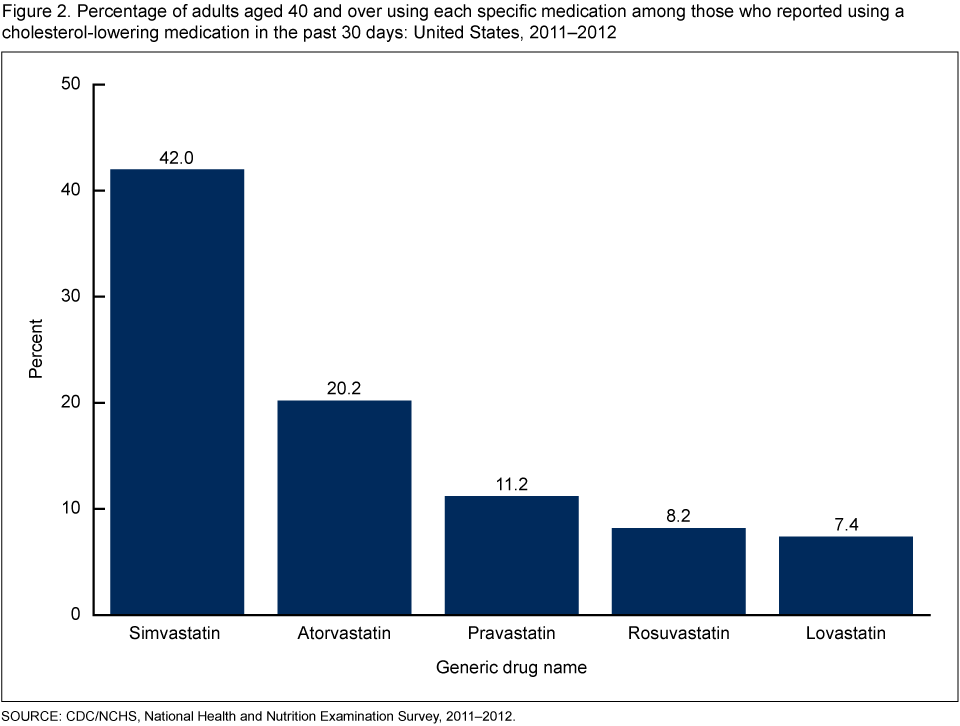 During 2003–2012, there was a significant increase in the percentage of adults aged 40 and over who used a prescription cholesterol-lowering medication. In 2003–2004, one in five adults reported using a prescription cholesterol-lowering medication in the past 30 days. By 2011–2012, that number had risen to one in four adults. In 2011–2012, the majority of adults using a cholesterol-lowering medication reported using a statin alone (83%). Ten percent used both a statin and a nonstatin and another 7% used only a nonstatin. Simvastatin was the most commonly used medication, with 42% of all cholesterol-lowering medication users reporting its use, followed by atorvastatin (20.2%).