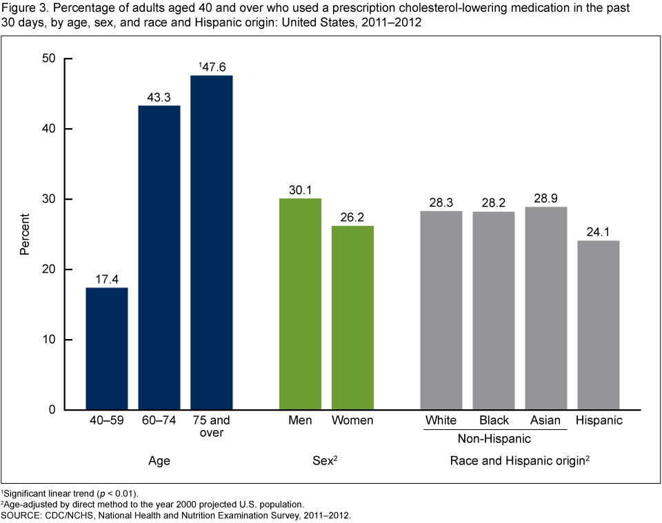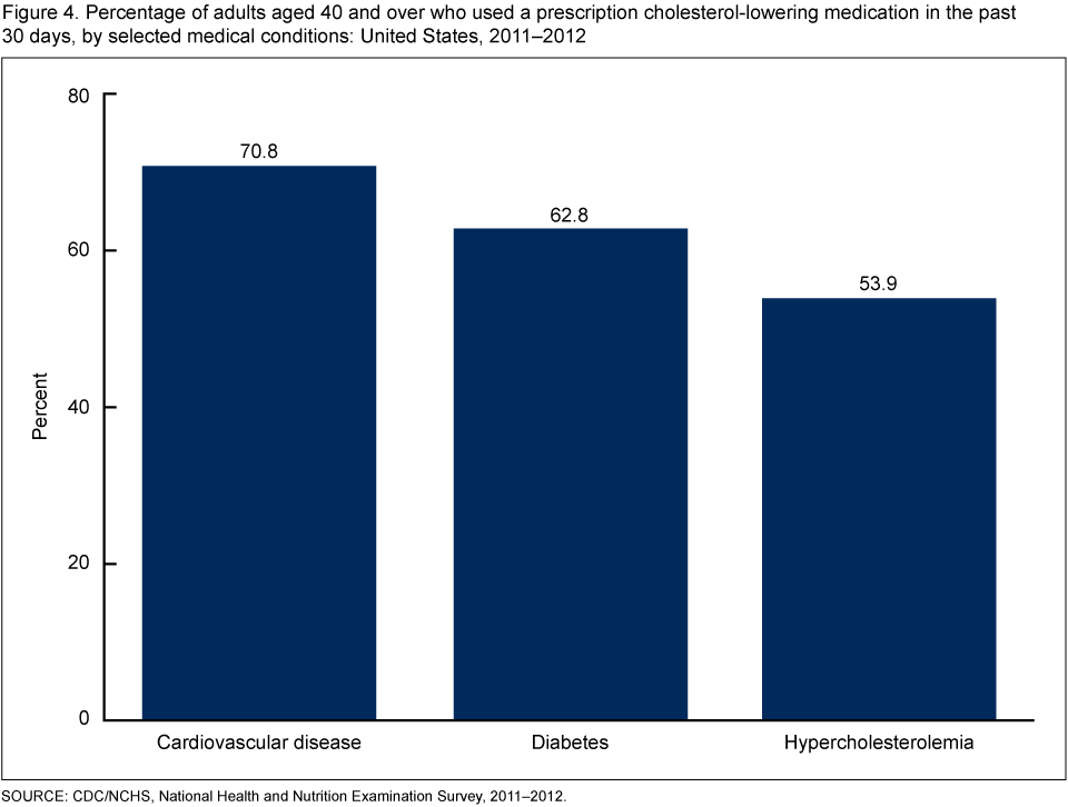 Gu Q, Paulose-Ram R, Burt VL, Kit BK. Prescription cholesterol-lowering medication use in adults aged 40 and over: United States, 2003–2012. NCHS data brief, no 177. Hyattsville, MD: National Center for Health Statistics. 2014.