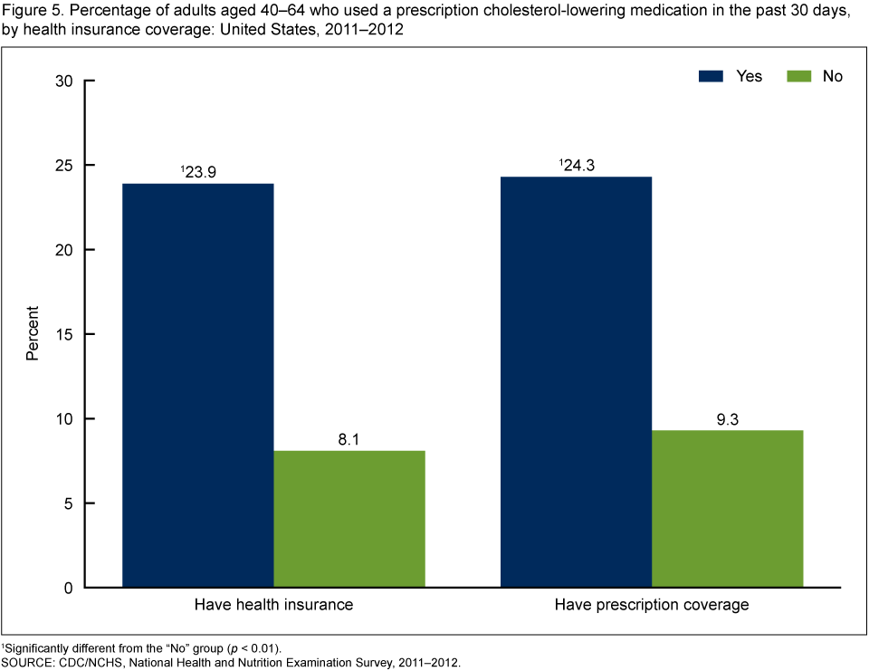 Figure 5. Percentage of adults aged 40–64 who used a prescription cholesterol-lowering medication in the past 30 days, by health insurance coverage: United States, 2011–2012