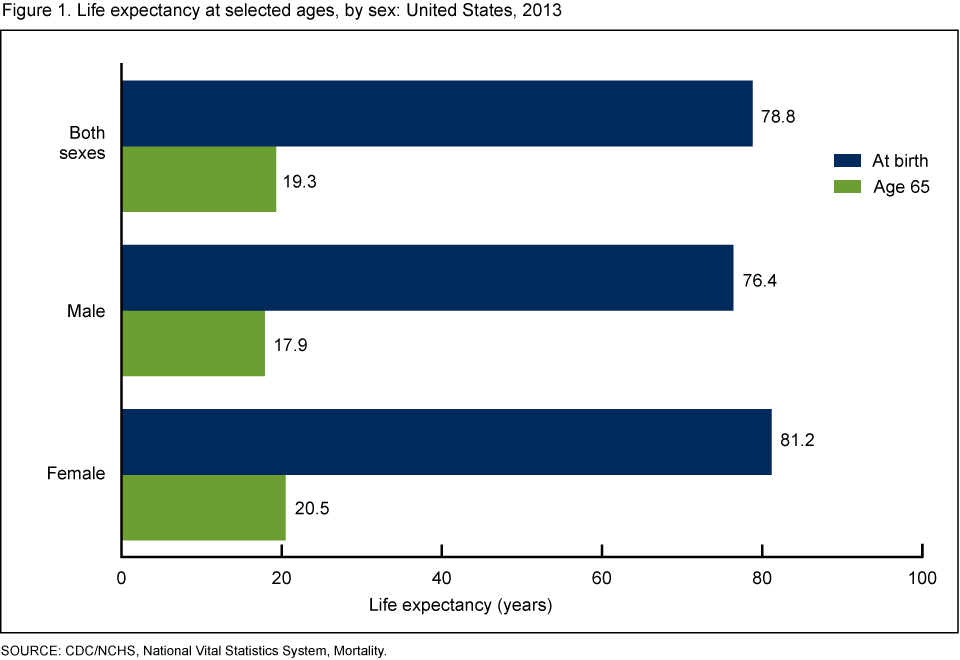 Life expectancy at birth represents the average number of years that a group of infants would live if the group was to experience throughout life the age-specific death rates present for the year of birth. U.S. life expectancy at birth for the total population was 78.8 years in 2013—the same as in 2012 (Figure 1). In 2013, life expectancy was 81.2 years for females and 76.4 for males. Life expectancy for females was consistently higher than that for males. In 2013, the difference in life expectancy between females and males was 4.8 years, the same as in 2012.