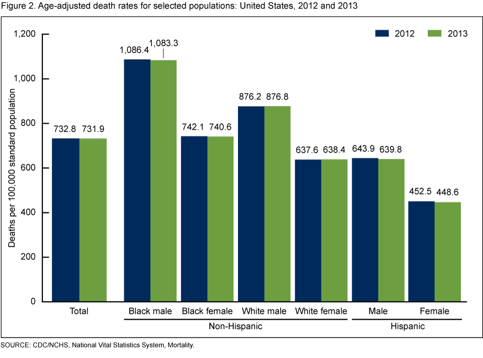 The age-adjusted death rate for the total population in 2013 of 731.9 per 100,000 standard population did not change significantly from the rate of 732.8 in 2012. From 2012 to 2013, age-adjusted death rates in the United States did not change significantly for either males or females among the non-Hispanic white, non-Hispanic black, and Hispanic populations (Figure 2).