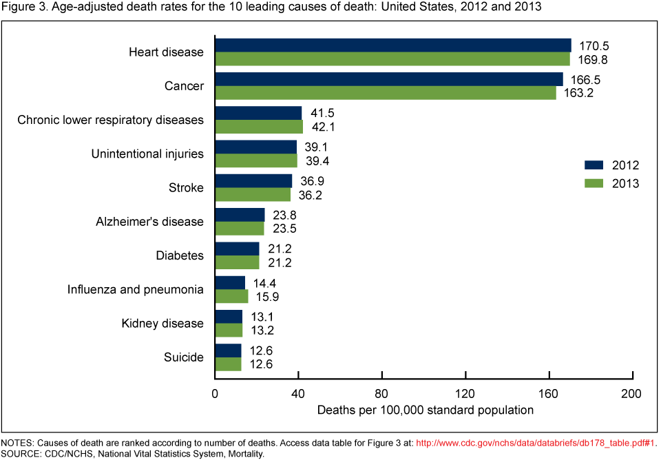 From 2012 to 2013, age-adjusted death rates decreased significantly for 4 of 10 leading causes of death. The rate decreased 0.4% for heart disease, 2.0% for cancer, 1.9% for stroke, and 1.3% for Alzheimer’s disease. The rate increased significantly by 1.4% for chronic lower respiratory diseases and by 10.4% for influenza and pneumonia. The rates for unintentional injuries and kidney disease did not change significantly, and the rates for diabetes and suicide remained the same.