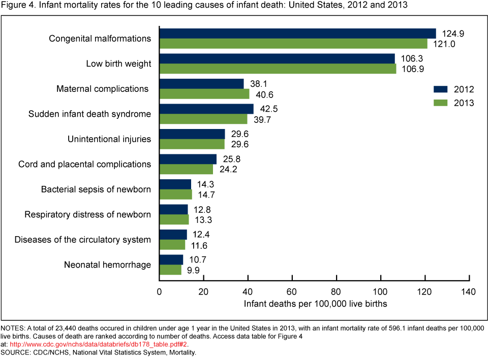 - The infant mortality rate in 2013 of 596.1 infant deaths per 100,000 live births did not change significantly from the rate in 2012. The 10 leading causes of infant death in 2013 remained the same as in 2012, although maternal complications became the third leading cause, while Sudden infant death syndrome became the fourth.